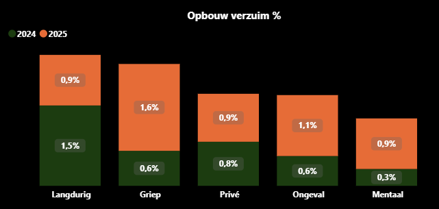 Deze visual helpt om veranderingen in context te plaatsen. Stijgt verzuim omdat gezondheid al langer onder druk staat, of is er juist sprake van tijdelijke pieken? Door naar trends te kijken in plaats van losse momenten, voorkom je dat beleid wordt aangepast op basis van ruis.