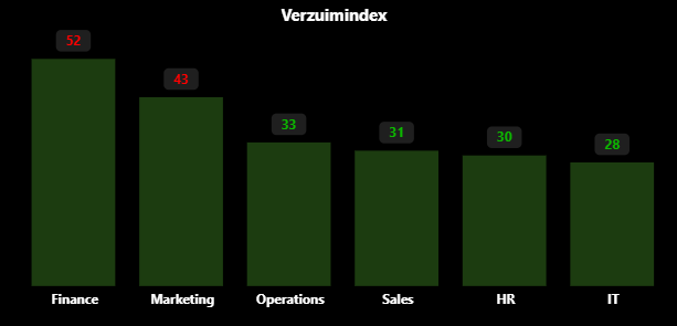 Het doel is niet om afdelingen met elkaar te vergelijken op prestaties, maar om te begrijpen waar structurele risico’s zitten. Door voorwaardelijke opmaak worden afwijkingen direct zichtbaar, waardoor het gesprek sneller verschuift van cijfers naar oorzaken.
