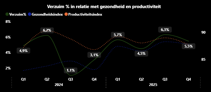 Verzuim is zelden een losstaand probleem. Deze visual laat zien hoe verzuim zich ontwikkelt in samenhang met gezondheid en productiviteit. Door deze drie indicatoren in één tijdlijn te plaatsen, ontstaat inzicht in oorzaak en gevolg.