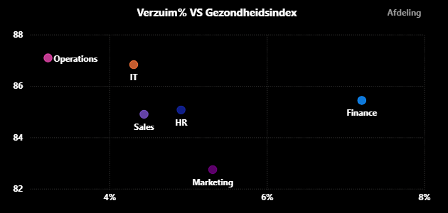 Deze visual maakt zichtbaar hoe verzuim zich verhoudt tussen afdelingen. Waar de KPI-kaart het totaalbeeld laat zien, legt deze visual bloot waar binnen de organisatie de verschillen ontstaan. Dat maakt het een krachtig instrument voor prioritering.