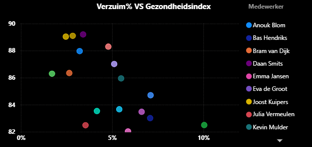 De mogelijkheid om te schakelen tussen medewerker- en afdelingsniveau maakt deze visual extra waardevol. Je kunt inzoomen op individuele casussen of juist uitzoomen naar team- en afdelingspatronen, afhankelijk van de vraag die speelt.