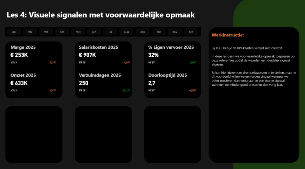In deze module leer je wanneer KPI-kaarten wél werken en wanneer niet. We gaan in op referentiewaarden, context, symbolen en het vermijden van ruis. Ook komt aan bod waarom meer KPI’s op één pagina vaak leidt tot minder inzicht, en hoe je KPI-kaarten gebruikt als navigatie-element binnen je dashboard.
