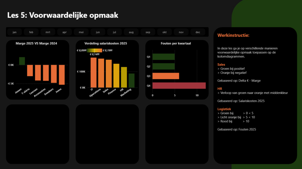 Deze modules zijn bedoeld voor iedereen die Power BI niet alleen wil gebruiken, maar ook wil begrijpen waarom een visual werkt of juist verwarring veroorzaakt. Met praktische voorbeelden uit finance, HR en logistiek vertaal je dit direct naar je eigen rapportages.